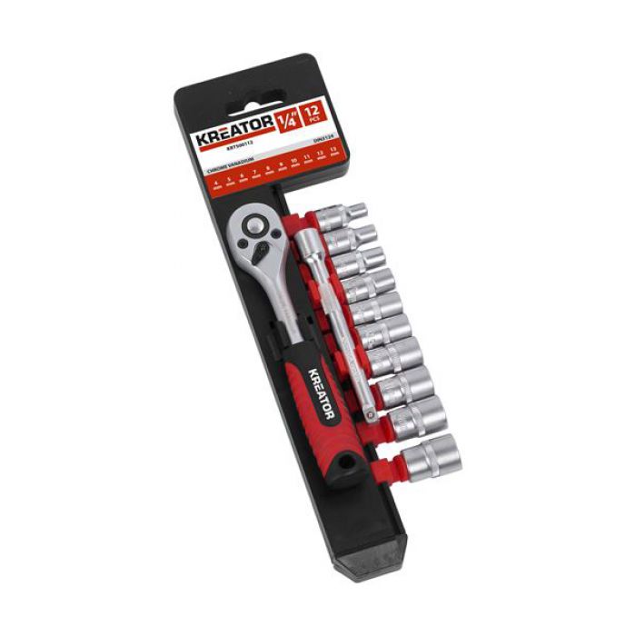 סט 12 חלקים ראצ'ט כדי לשחרר או להדק ברגים. בוקסות בעלי חיבור "1/4, עשויים מכרום ונדיום בגימור סאטן והם עומדים בתקני DIN 3124. הידית הארגונומית מספקת אחיזה איתנה.