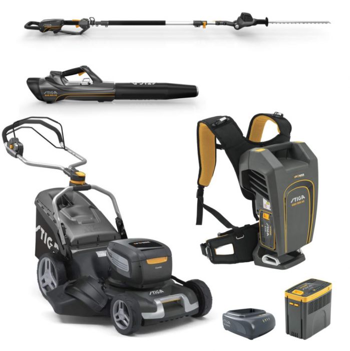 מכסחת נסיעה, מפוח, מגזמת גובה, מנשא, סוללה 7.5 ומטען STIGA
