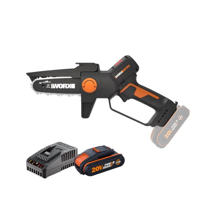 מסור שרשרת "5 בראשלס 20V נטען + סוללה 2.0Ah + מטען מהיר WORX WG325E.9