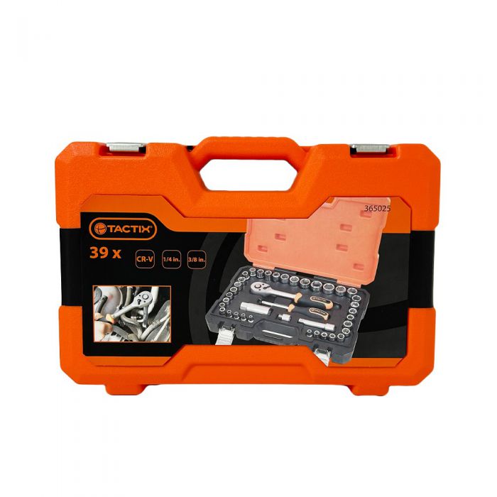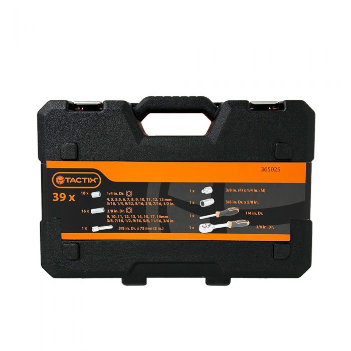 19 pc 3/8 in. Dr. 12PT socket: 10, 11, 12, 13, 14, 15, 16, 17, 18, 19mm; 1/4, 5/16, 3/8, 7/16, 1/2, 9/16, 5/8, 11/16, 3/4 in.