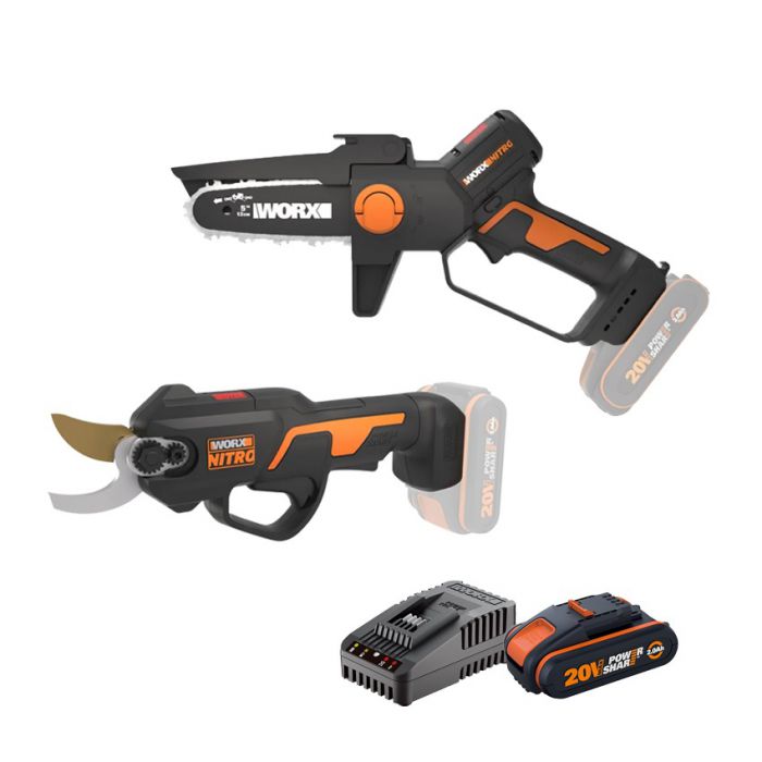 סט כלי גינון נטענים NITRO בראשלס מסור שרשרת "5 WG325E.9 + מזמרה נטענת 20V WG330E.9 + סוללה 2.0Ah + מטען מהיר WORX