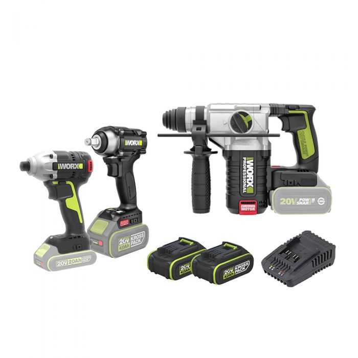 סט 3 כלים מברגה WU290 + פטישון WU388 + מפתח רטיטה WE272 + זוג סוללות 4A + מטען WORX WU-SET03.4