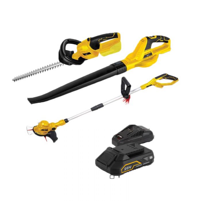 סט כלי גינון נטענים 20V מפוח עלים + קוצץ קנטים + גוזם גדר + סוללה 2.0A + מטען מהיר GPT TOT043